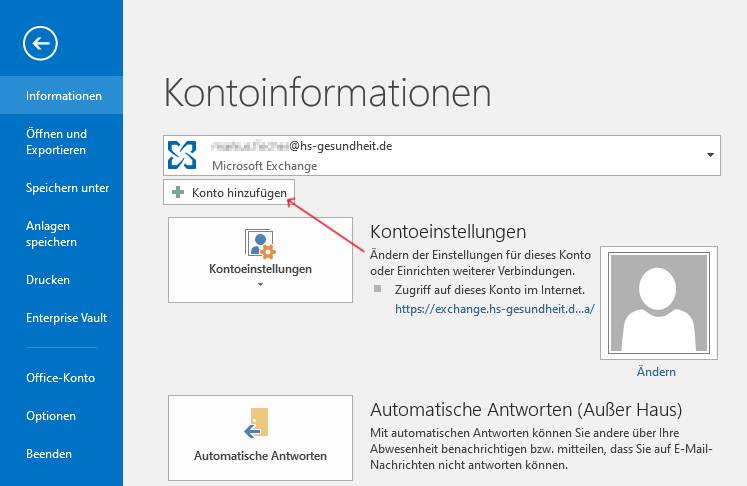 Öffnen Sie Ihr Outlook und klicken Sie im Menü auf "Datei" -> "Konto hinzufügen"