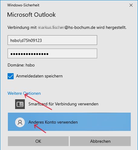 Nach Bestätigung des Fensters mit dem Button "Weiter" wird Ihr Benutzername abgefragt. Klicken Sie auf "Weitere Optionen", dann auf "Anderes Konto verwenden". In der Mail des IT-Supports (oder im beigefügten PDF) finden Sie Ihren Benutzernamen. Dieser entspricht NICHT Ihrer Mail-Adresse. Bitte fügen Sie die Domäne hsbo\ vor dem Benutzernamen hinzu.