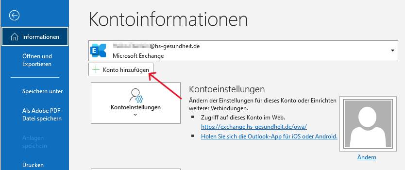Öffnen Sie Ihr Outlook und klicken Sie im Menü auf "Datei" -> "Konto hinzufügen"