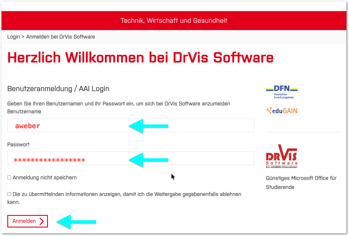 Dieser Schritt ist i.d.R. nur bei der ersten Anmeldung mit dem HSBO-Account bei DrVis notwendig.