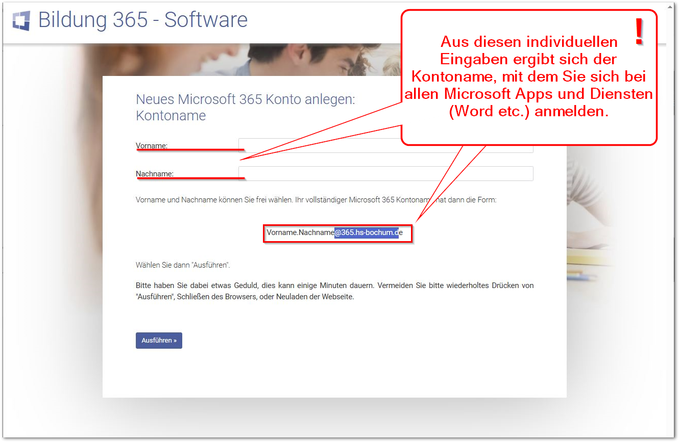 Aus dieser Eingabe wird Ihr Microsoft-Konto mit dem Benutzer EingabeVorname.EingabeNachname@365.hs-bochum.de generiert. Hiermit melden Sie sich in allen Microsoft Apps (z.B. Word) an.