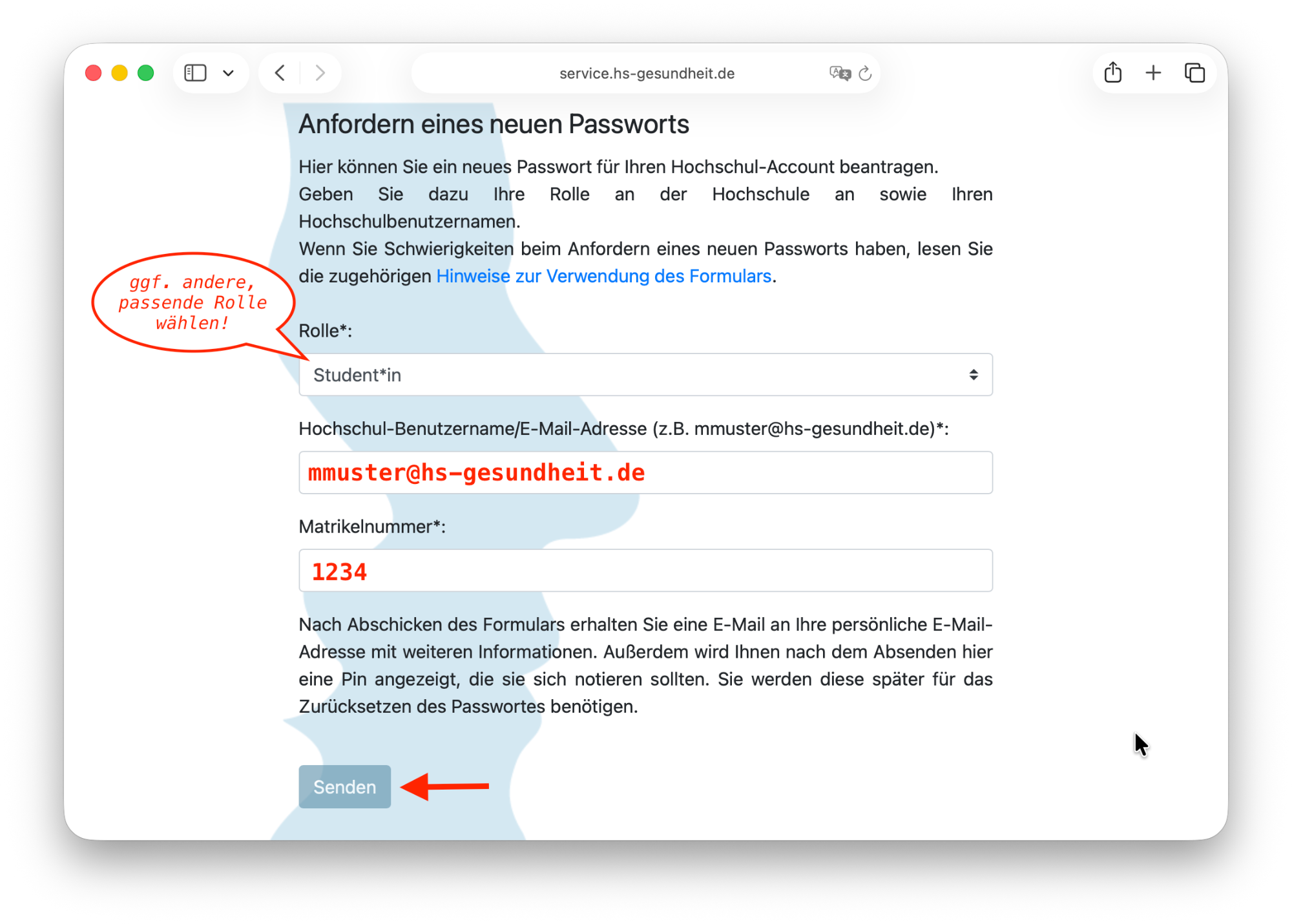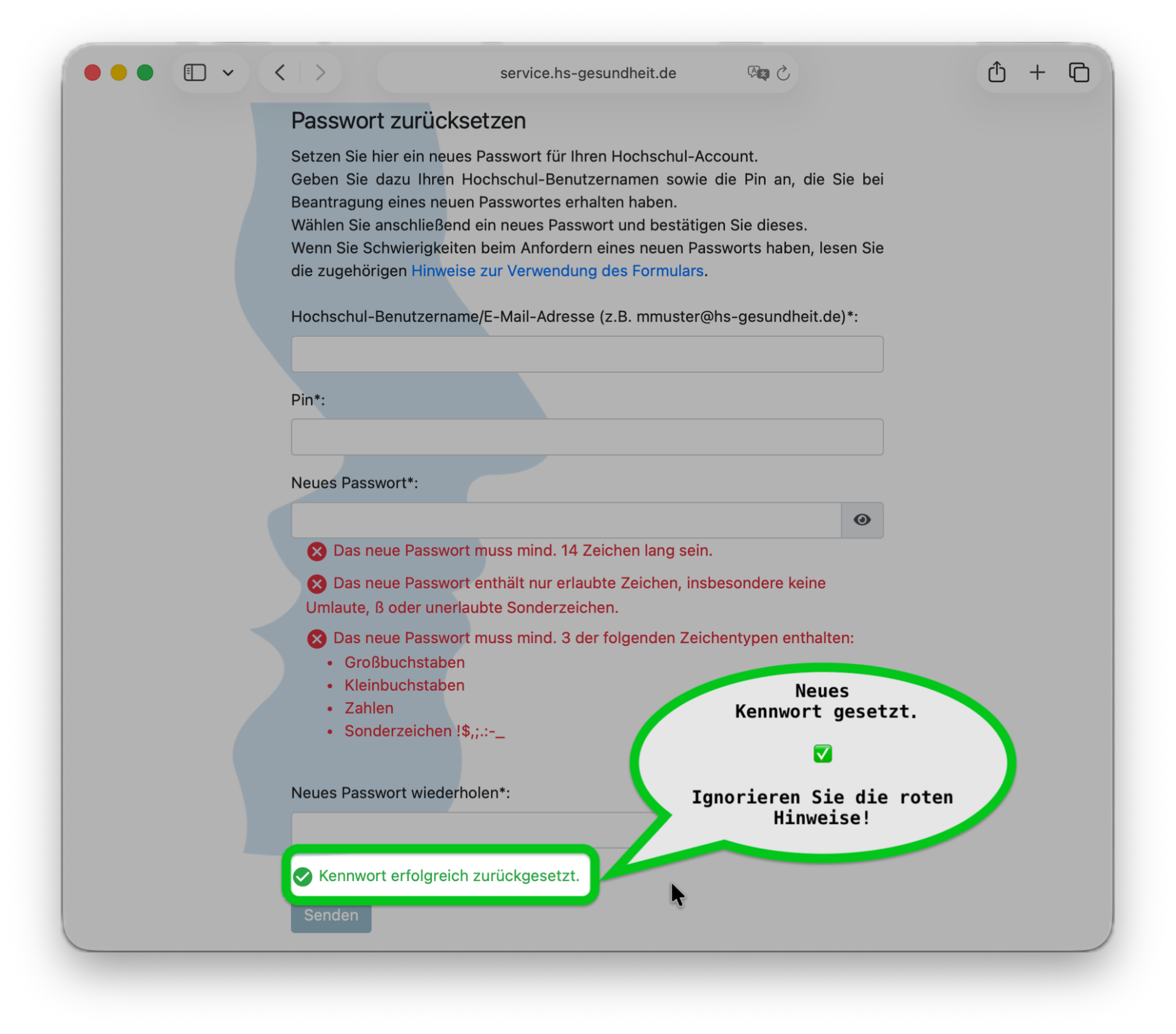 - Lesen Sie zunächst diese Anleitung und starten Sie erst dann auf Seite 🔗https://service.hs-gesundheit.de/PasswordManagerNg/requestpwreset