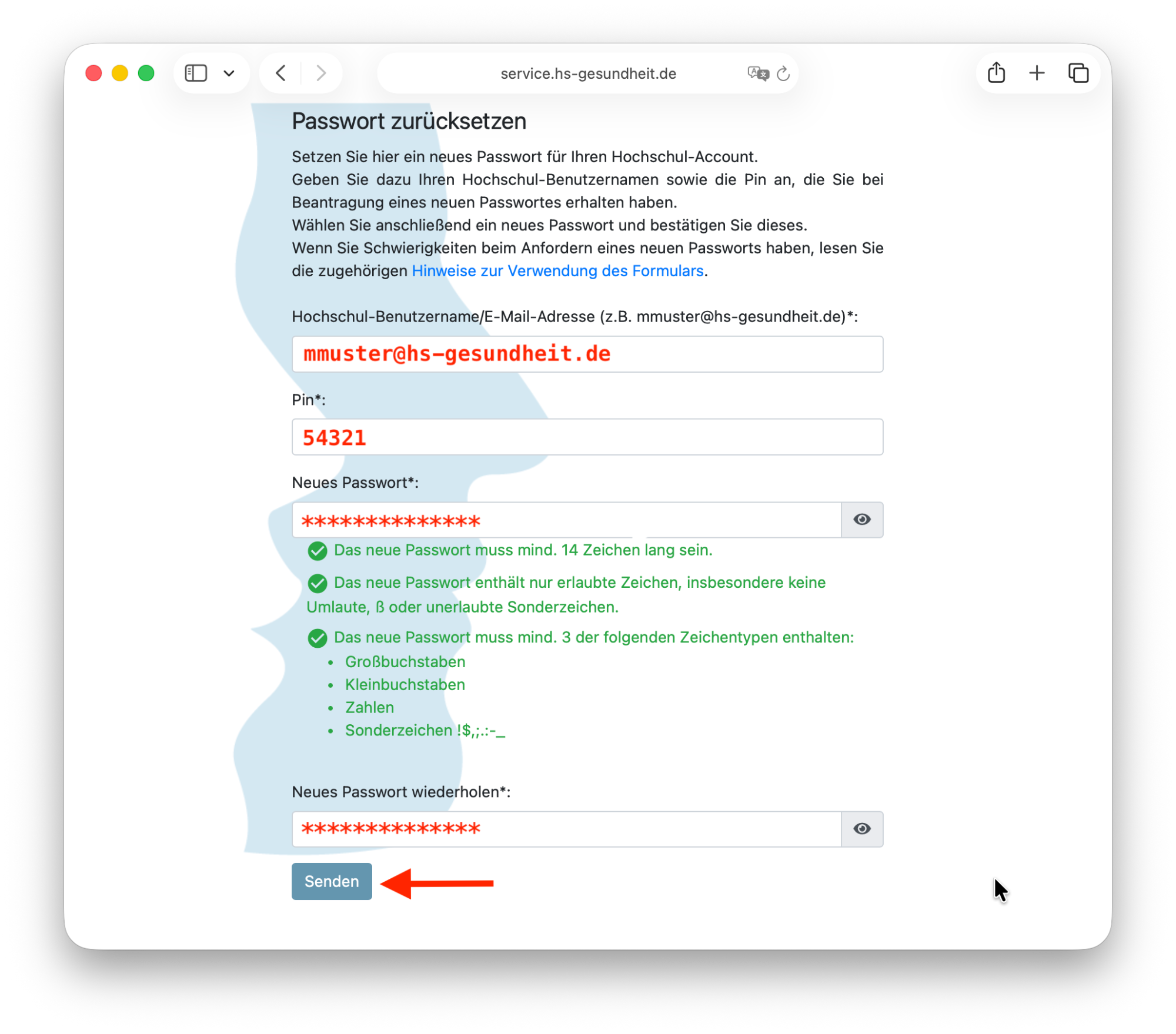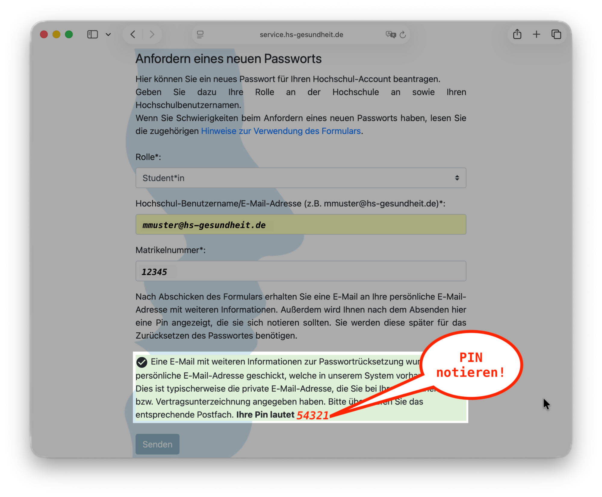- Sie können den Vorgang durch Verwendung der Adresse https://service.hs-gesundheit.de/PasswordManagerNg/requestpwreset beliebig oft wiederholen. So erhalten Sie stets eine neue gültige PIN mit dem zugehörigen Link.