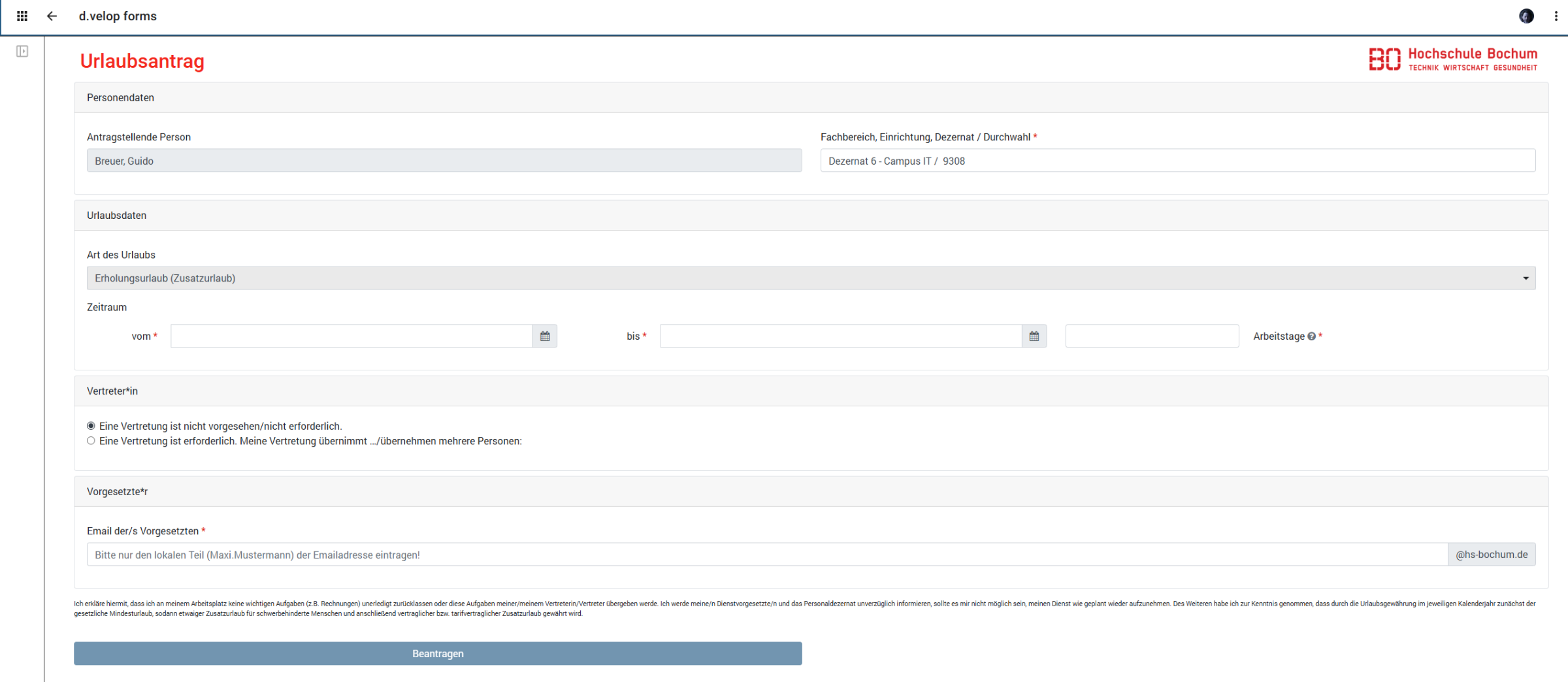 Sobald die wenigen Pflichtfelder (mit * markiert) befüllt sind, können Sie den Urlaubsantrag mittels des unten befindlichen blauen Buttons "Beantragen" absenden.