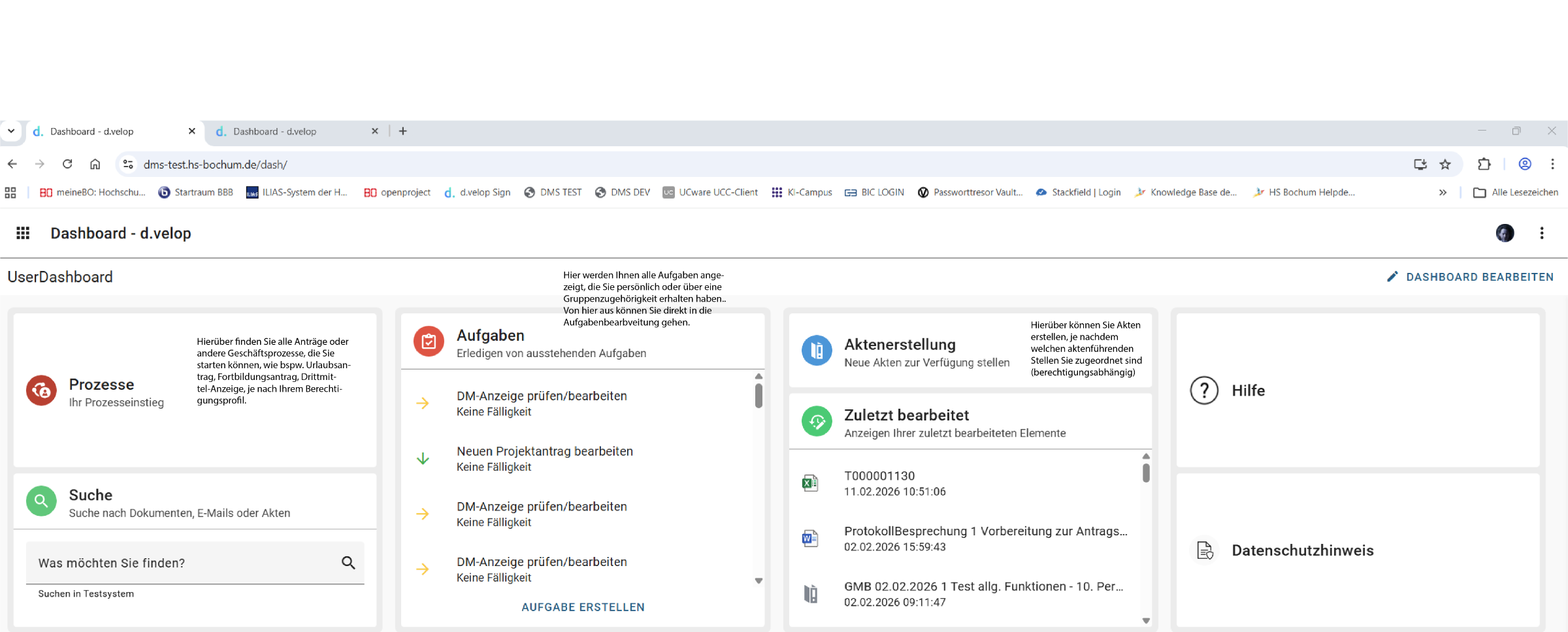 Dieses Widget ist wichtig, weil Sie nach Aufruf alle Prozesse finden, die für Sie bereitgestellt werden. Das sind hauptsächlich Anträge aller Art, die über das DMS in digitaler Form gestellt werden und meist einen Workflow zur Bearbeitung automatisch starten, der Sie und andere an dem Prozess Beteiligten durch den Ablauf führt.