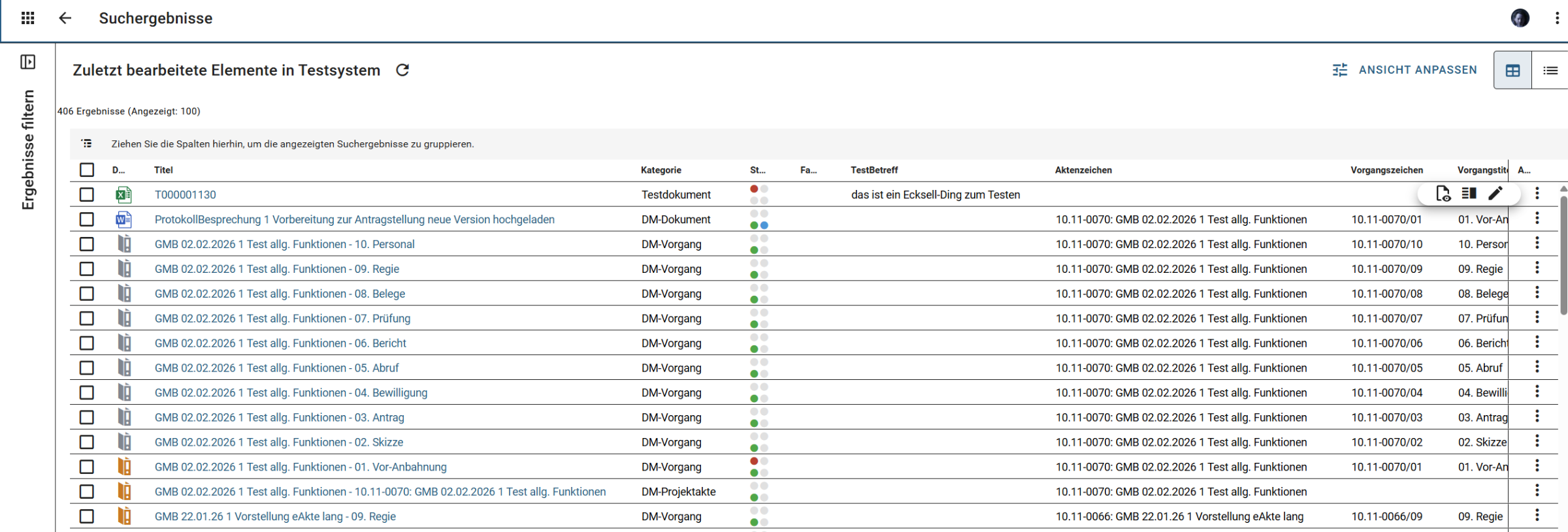 Im Dashboard werden Ihnen die ersten Elemente direkt angezeigt. In dieser Ansicht können Sie auch scrollen, wenn das gesuchte Element nicht unter den ersten angezeigten Dokumenten ist. Mit Klick auf die Überschrift können Sie auch die tabellarische Übersicht öffnen, die weitaus mehr Elemente enthält.